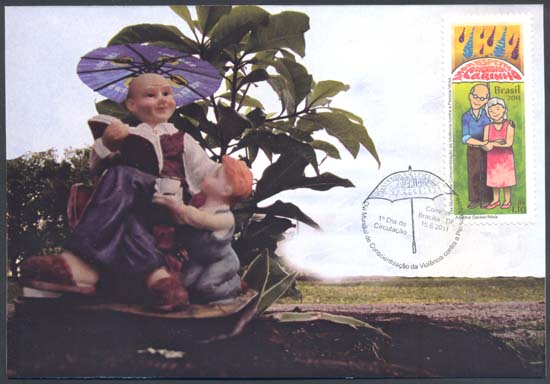 Para simbolizar a proteção, a solidariedade e o respeito às pessoas idosas, o selo retrata um casal de idosos sob um guarda-chuva, estampado com as palavras AMOR, RESPEITO, DIGNIDADE e CARINHO, imprescindíveis à conscientização contra a violência a essa classe de pessoas. Acima do guarda-chuva protetor estão impressas as palavras agressão, indiferença, violência e desrespeito, representadas em forma de gotas d’água, que são repelidas, não atingindo os idosos protegidos das tormentas de atos que impeçam a sua felicidade, integridade e qualidade de vida. Técnicas utilizadas: desenho com caneta hidrocor e computação gráfica.