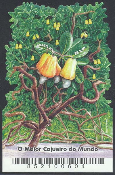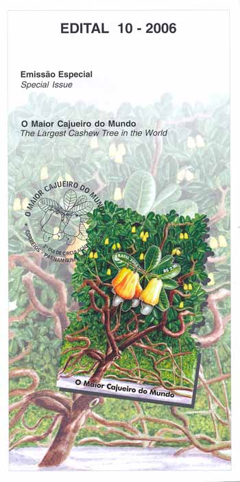 O bloco apresenta, de forma estilizada, a árvore do maior cajueiro do mundo. Para representar a extensão de sua copa, foi utilizada a vista de seu tronco principal e suas extensões, dando uma idéia de sua estratégia de formar novos troncos com a própria copa. As folhas da árvore foram dimensionadas para que o recorte previsto seguisse o contorno do desenho em três lados, ao invés do tradicional horizontal vertical. Para compor o selo, utilizou-se a frutificação, com o desenho que se projeta em primeiro plano e em proporção diferente do conjunto. A técnica utilizada para compor a imagem foi a pintura em aquarela e a diagramação por computação gráfica.