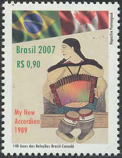 "Meu Novo Acordeão'; de Napachie Pootoogook (Cape Dorset), 1989, litografia, Museu da Civilização do Canadá CD1989-023. Muitas mulheres inuits' tocavam acordeão, instrumento trazido para o norte pelos caçadores de baleias escoceses no final do século dezenove. Com dedos ágeis, um acordeão poderia inspirar os caçadores de baleia e os Inuits a dançar ao som de canções entusiasmadas até a madrugada. Napachie Pootoogook lembra esse evento feliz de sua infância. Ela descreve seu novo instrumento como um caleidoscópio de cores, traduzindo o som de sua música em uma forma visual vibrante. Esta gravura integra a exposição de arte inuit Isumavut, que percorrerá diversas cidades brasileiras entre 2007 e 2008. Compondo a imagem do selo, na parte superior, destacam-se as bandeiras do Brasil e do Canadá. Foram utilizadas as técnicas de litografia e composição gráfica.