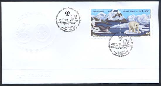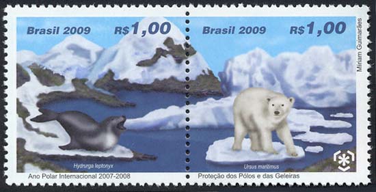 O se-tenant registra duas riquezas da fauna das regiões polares, ressaltando a importância dessas espécies e a preservação do seu ecossistema, o que é fundamental para o equilíbrio ecológico do planeta. O selo da esquerda focaliza a imagem da foca-leopardo do hemisfério sul (Antártica), Hydrurga leptonyx, que possui como característica, além da robustez, manchas pretas sobre a pelagem. No selo da direita, o urso-polar, conhecido como urso-branco, Ursus maritimus, da região polar norte (Ártico) e, no canto inferior direito, a logomarca cristal de gelo, que identifica as emissões sobre a proteção dos pólos e das geleiras. Na imagem de fundo, uma paisagem das geleiras continentais, que reportam à sua preservação. A flora da área é composta por vegetais inferiores (algas, fungos, liquens e musgos). Foram usadas as técnicas de desenho e computação gráfica.