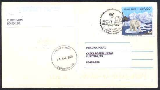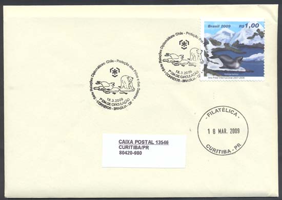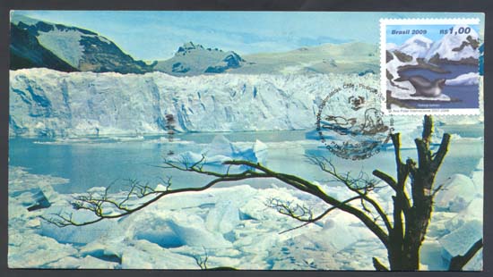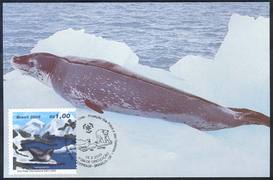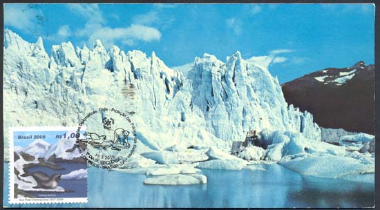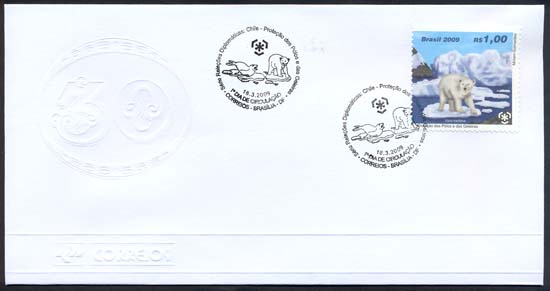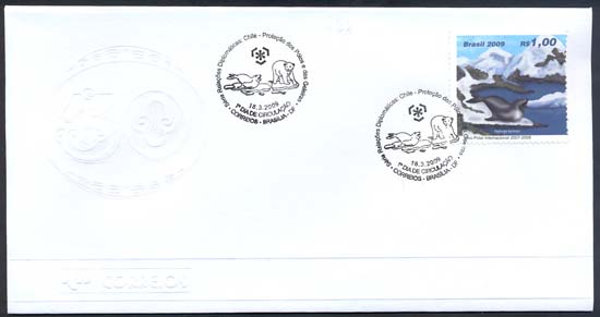 Os selos e o carimbo comemorativo ilustram: regiões polares, fauna, meio ambiente, ano polar internacional, emissões conjuntas.