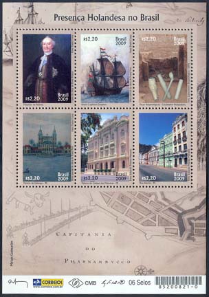 O primeiro selo da minifolha, retrata Maurício de Nassau, em obra de Pieter Nason, personalidade marcante de um período especial da história pernambucana, denominado Período Nassoviano. Os outros selos apresentam o Palácio de Friburgo, e a Nau Capitânia Zutphen, na qual viajou Nassau, reproduções parciais de quadros do artista holandês Frans Post, cachimbos holandeses achados em escavações no Forte Orange, e duas fotografias que mostram o Palácio do Campo das Princesas, idealizado em 1786, atual centro administrativo do governo estadual pernambucano, próximo de onde se situava o Palácio de Friburgo, sede do governo no período holandês. E, ainda, a rua Aurora, às margens do rio Capibaribe, onde se destaca o conjunto arquitetônico de sobrados do século XIX, que reportam ao Recife antigo. Foi usada a técnica de fotografia.
