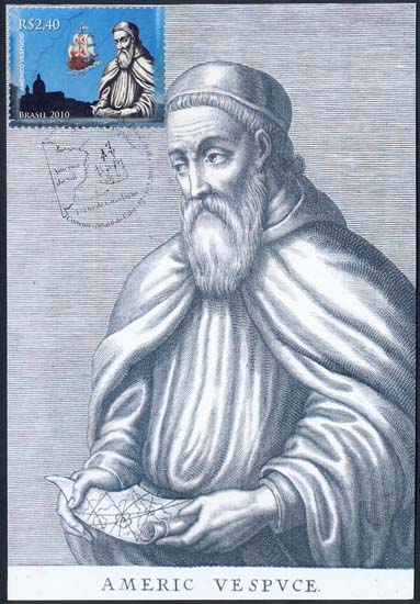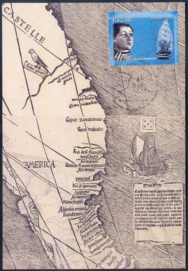 Os elementos usados no bloco, sobre um fundo azul, remetem à vida de Américo Vespúcio. São mapas, cartas, panoramas de Florença (Itália) e Arraial do Cabo (Brasil). Abaixo, à esquerda, uma imagem da Igreja de Nossa Senhora dos Remédios, de 1506, construída em pau-a-pique, primeira igreja onde foi celebrada uma missa no Brasil e o Obelisco Américo Vespúcio, na Praia dos Anjos, que marca o local onde aportou, em 1503, a primeira armada portuguesa. Abaixo, à direita, o Pórtico de Arraial do Cabo e a logomarca do Ano da Itália no Brasil, que ocorrerá em 2011. O selo superior retrata o navegador florentino Américo Vespúcio ainda na juventude, e, no inferior, sua imagem na maturidade, já reconhecido como desbravador do Novo Mundo, famoso, inclusive, por suas narrativas sobre as terras descobertas. Os selos mostram, também, caravelas típicas dos séculos XV e XVI.