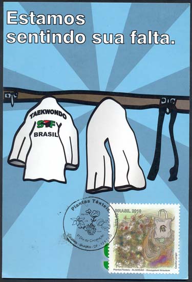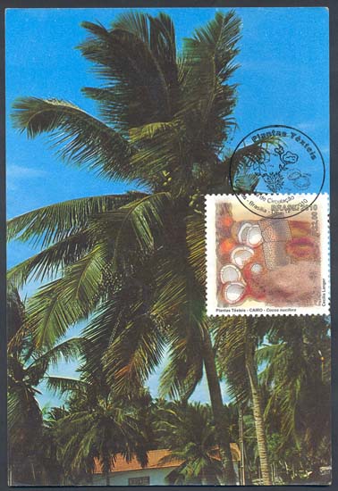 Esta emissão, por suas caracteristicas pictoriais, em que é mostrada a planta e exemplos dos produtos elaborados com as diferentes fibras, permite um amplo espectro de criatividade na montagem de "máximos postais", mediante a utilização de cartões postais que mostrem quer a planta "in natura" quer os inúmeros produtos. Por esse motivo, nos permitimos exagerar na criação dos "máximos", que em alguns casos seriam considerados como apenas "curiosidades filatélicas" bem como deixar de lado a preocupação com a concordância de local, pois o carimbo comemorativo é de Brasilia, enquanto os cartôes são de várias regiôes, inclusive outros países. Entendo que easas montagens trazem grande satisfação pessoal e embelezam qualquer coleção para exposição em mostra não competitiva. Já ao preparar uma coleção para inscrição em mostra competitiva, a maioria dos "máximos" não deveria ser considerada, sob pena de infração às regras e consequente perda de pontos. Com relação às fibras e seus produtos, pode ter ocorrido eventual equívoco na sua identificação.
