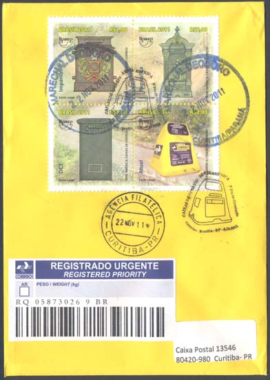 Empenhada no objetivo de associar as Caixas de Correio a importantes fases da história do Brasil, a Empresa Brasileira de Correios e Telégrafos selecionou para esta quadra de selos as caixas representativas do Império, da República, do DCT – Departamento de Correios e Telégrafos – e dos dias atuais.