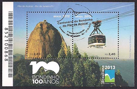 A foto reproduzida no bloco registra, em uma tarde de céu límpido, a saída de mais um passeio de turistas no Bondinho Pão de Açúcar, que, há 100 anos, propicia aos visitantes admirar a beleza do complexo turístico da cidade do Rio de Janeiro. Os selos focalizam o pico do Pão de Açúcar, uma das estações do passeio, e o bondinho no teleférico. Abaixo dos selos, as logomarcas do centenário do bondinho e a da Exposição Filatélica Mundial Brasiliana 2013. Foram utilizadas as técnicas de fotografia e de computação gráfica.