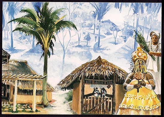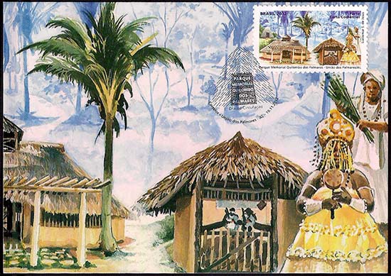 O selo retrata, ao fundo em azul, uma panorâmica do primeiro e único parque temático sobre a cultura negra do País – Parque Memorial Quilombo dos Palmares, localizado na Serra da Barriga, em Alagoas. À esquerda, tem-se, em primeiro plano, a construção Muxima de Palmares (Coração de Palmares), em homenagem aos comandantes-em-chefe que formavam o conselho deliberativo do Quilombo. Já em segundo plano, há uma oca indígena, que representa a cultura dos primeiros habitantes da Serra da Barriga. À direita, aparece a edificação Onjo Cruzambê (Casa do Campo Santo), espaço de apoio às práticas das religiões de matriz africana. Ao lado da edificação, duas figuras femininas representam as práticas religiosas desse espaço sagrado. A técnica utilizada foi pintura.