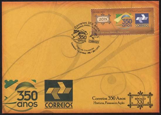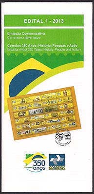 A emissão Correios 350 Anos: História, Pessoas e Ação foi concebida em uma folha de 24 selos, destacando fatos relevantes no contexto dos 350 anos da Instituição, abordados a partir de três pilares: os principais marcos históricos, o desenvolvimento tecnológico e as pessoas que fazem a história dos Correios no Brasil. A folha segue ordem cronológica, a partir de 1663, com o início da atividade postal regular no Brasil, culminando em 2013, momento da comemoração dos 350 anos. Encerrando a folha de selos, vê-se a logomarca oficial dos 350 anos dos Correios. A técnica utilizada foi fotografia e computação gráfica.