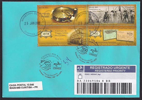 Envelope circulado, registrado com carimbos datador e comemorativo de 1º dia de circulação sobre quadra