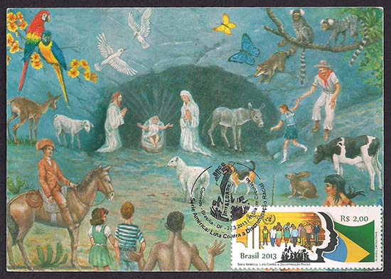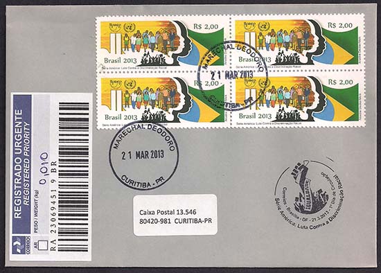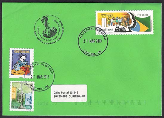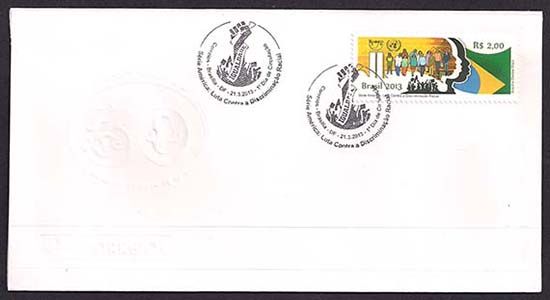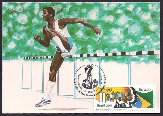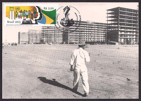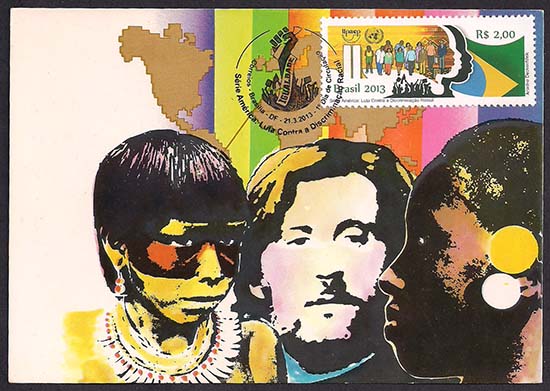 O selo ilustra: Etnia, sociologia, movimentos sociais, campanhas governamentais, luta contra a discriminação racial de pessoas negras, simbolos nacionais, bandeira do Brasil, edifícios públicos, Congresso Nacional, Upaep e Nações Unidas.