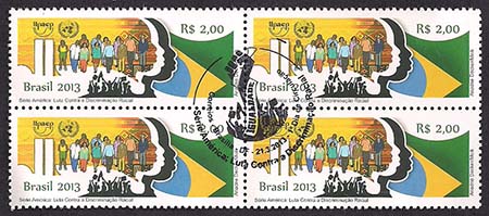 O selo apresenta três rostos em perfil, simbolizando a diversidade racial. O perfil na cor preta se estende até a representação da luta contra a discriminação racial, ao centro da margem inferior. A figura do perfil colorido com estampas destaca pessoas negras em situação cotidiana, profissionais, família e atletas, em igualdade de oportunidades, caminhando sobre uma rampa que se transforma na faixa central da bandeira brasileira, representada ao lado direito do selo. No lado esquerdo da composição, o desenho do Congresso Nacional sob os símbolos da União Postal das Américas, Espanha e Portugal – UPAEP e da Organização das Nações Unidas.