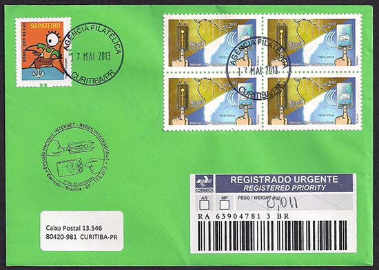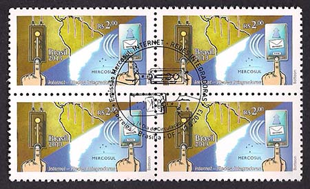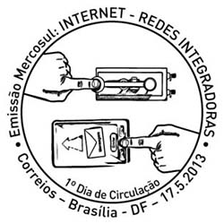 O selo ilustra: Mercosul, comunicações, tecnologia, redes integradoras, Internet, telégrafo, políticas regionais, geografia.