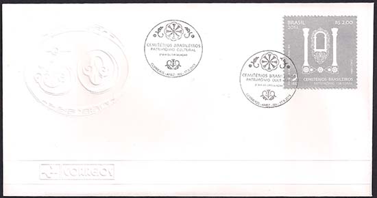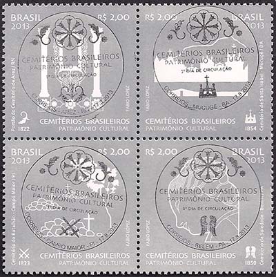 A quadra focaliza, artisticamente, elementos essenciais de cemitérios brasileiros tombados como patrimônio cultural pelo Instituto do Patrimônio Histórico e Artístico Nacional (IPHAN). O Cemitério de Arez (RN) foi representado por um detalhe de seu portão tombado. O Cemitério do Batalhão (PI), por algumas sepulturas e uma árvore, destacando a beleza e a simplicidade do lugar. As sepulturas brancas à frente do fundo montanhoso são os elementos destacados do Cemitério de Santa Isabel (BA). O selo alusivo ao Cemitério da Soledade (PA) traz em detalhe a imagem de uma das muitas estátuas que ornamentam o local. O uso da cor prata dá aos selos um caráter de relíquia e preciosidade, valorizando a percepção dos cemitérios a serem preservados como patrimônio cultural. A técnica utilizada foi ilustração vetorial.