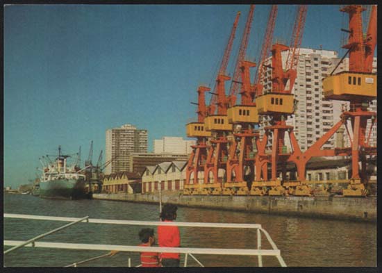 Cartão-Postal de emissão Mercator, Brasil Turístico, E-9'9 - Porto Alegre - RS, Vista parceial do cais do pôrto e "Rio Guaiba"