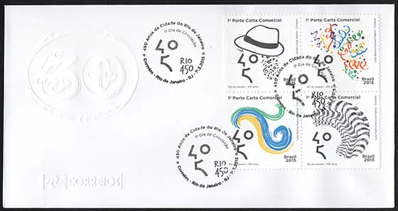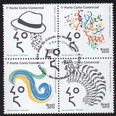 A quadra de selos Rio450 anos destaca ícones famosos do Rio de Janeiro, expressando o espírito festivo do carioca com os 450 anos da cidade. A partir da marca das comemorações, que expõe uma cabeça estilizada, é reforçado o potencial do carioca de pensar, de agir e de expressar-se com entusiasmo, criatividade, talento e inteligência frente às motivações históricas e culturais da cidade maravilhosa. No primeiro selo, o chapéu e as notas musicais remetem à boemia e à musicalidade de forte impacto dentro e fora do País. O segundo selo, por meio de serpentinas e confetes coloridos, demonstra a alegria do carnaval, manifestação cultural que consagra o Rio de Janeiro internacionalmente. No terceiro selo, a tríade areia-mar-mata, representada em ondas, nas cores amarelo, azul e verde, simboliza a brasilidade e o patrimônio turístico, ecológico e cultural do Rio de Janeiro. O último selo apresenta o Calçadão de Copacabana, por onde a vida transita em meio à alegria, à descontração e ao vigor que caracterizam o cotidiano da cidade. Para a criação das peças, a técnica empregada foi computação gráfica.