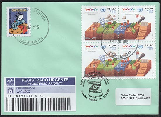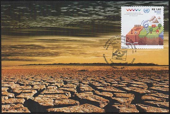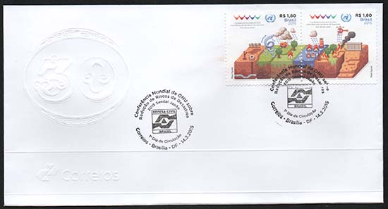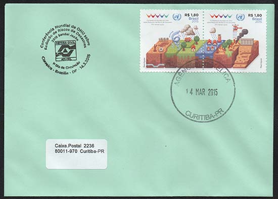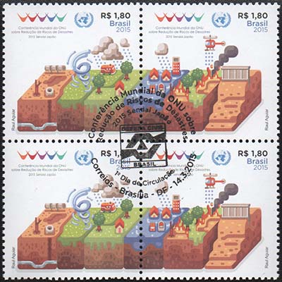O se-tenant, composto de dois selos, destaca, da esquerda para a direita, blocos coloridos simbolizando a terra, sobre os quais se encontram elementos representativos dos principais fenômenos naturais causadores de desastres, quais sejam: no primeiro bloco, a seca e a estiagem; nos blocos seguintes, de superfície verde, o vendaval, o granizo e a geada; no bloco azul, a inundação; no bloco ao lado, facilmente identificado, o incêndio florestal e, no último, o deslizamento e a erosão. Sobre cada bloco, encontram-se representados elementos que simbolizam a ação da Defesa Civil Nacional no trabalho de evitar ou minimizar os efeitos dos sinistros sobre a comunidade, como: mapeamento das áreas de risco; prevenção (adutoras, construção de poços, contenção de encostas); monitoramento e alerta; e respostas aos desastres, por meio do combate a incêndios, socorro, resgate e assistência às vítimas. Na parte superior de cada selo, veem-se os logotipos da Conferência Mundial da ONU sobre Redução de Riscos de Desastres, 2015 Sendai – Japão, e da ONU, organizadora do evento. Foi utilizada a técnica de computação gráfica.