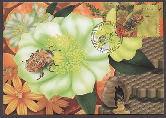 A Minifolha apresenta seis espécies de abelhas melíponas (sem ferrão) presentes no território brasileiro: Melipona quinquefasciata (Uruçu do Chão), Melipona rufiventris (Uruçu Amarela), Melipona subnitida (Jandaíra), Nannotrigona testaceicornis (Iraí), Paratrigona lineata (Jataí da Terra) e Plebeia flavocincta (Jatí). A partir das características anatômicas e do habitat de cada uma dessas espécies de abelhas melíponas foi produzida a imagem da minifolha com os respectivos selos, de modo a conciliar, harmoniosamente, as abelhas em meio à natureza. O título da emissão é exibido na parte superior da peça, e, no canto inferior direito, é divulgada a Exposição Filatélica London 2015. Foram utilizadas as técnicas de quadricromia (CMYK) com aplicação serigráfica de verniz aromático e computação gráfica combinando recursos de softwares vetoriais e pintura digital.