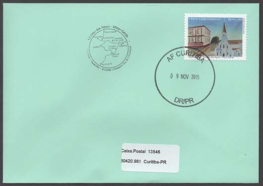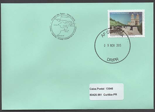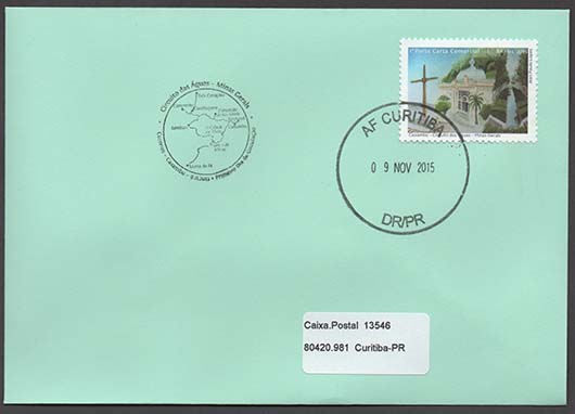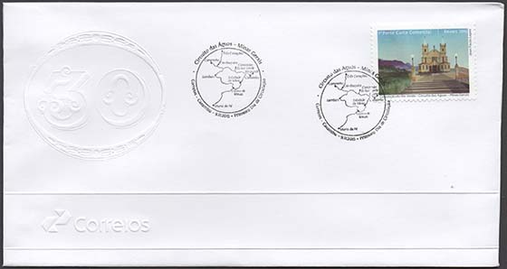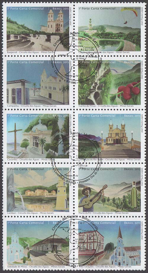 Arte: Jean Paulo Lopes Processo de Impressão: ofsete Folha: 30 selos Papel: cuchê gomado Valor facial: 1º Porte Carta Comercial Tiragem: 1.800.000 selos Área de desenho: 35mm x 25mm Dimensão do selo: 40mm x 30mm Picotagem: 11,5 x 12 Data de emissão: 9/11/2015 Locais de lançamento: Baependi, Cambuquira, Campanha, Caxambu, Carmo de Minas, Conceição do Rio Verde, Maria da Fé, Lambari, Soledade de Minas e Três Corações/MG Impressão: Casa da Moeda do Brasil