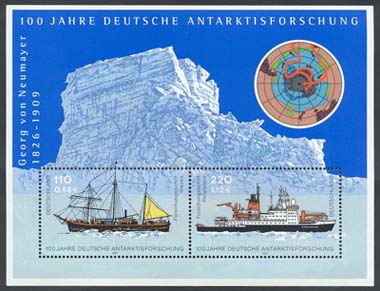 O bloco foi emitido em comemoração do centenário do início da exploração alemã da região antártica. Faz referência ao explorador Georg von Neumayer (n 1826 f 1909) que se destacou acima de tudo como um defensor da pesquisa científica do Polo Sul. Os dois selos mostram navios quebra-gelo de pesquisa, o Gauss e o Polar Stern".