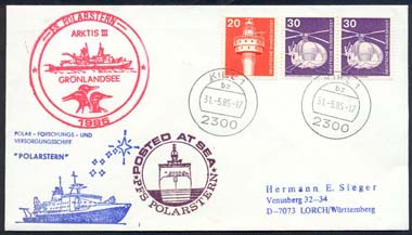 Carimbo datador, sobre envelope circulado. Carimbo "Posted at Sea", navio PolarStern. Carimbo ArktisIII, Gronlandsee.