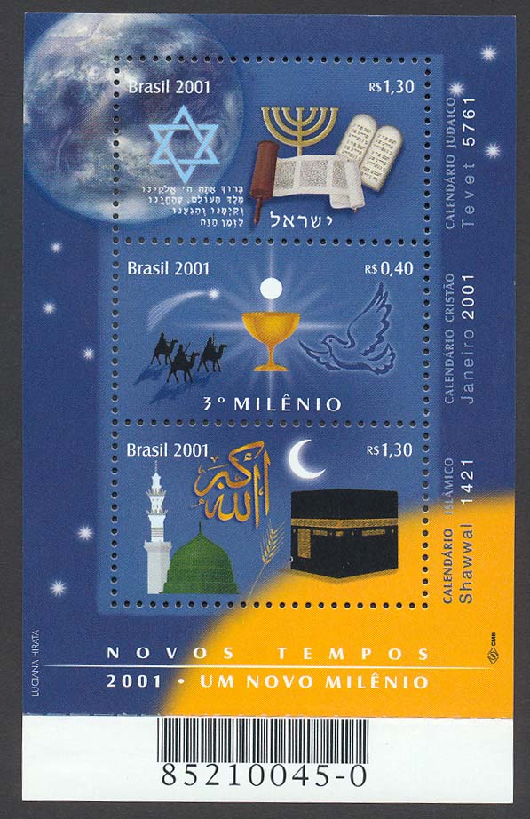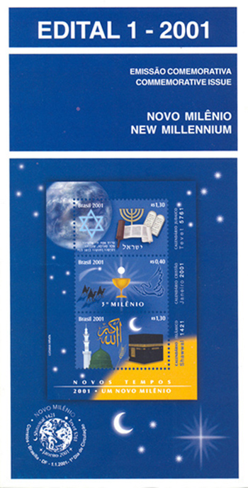 Edital n. 1 Arte : Luciana Hirata Processo de Impressão: Offset Papel: couché gomado Folha: 25 selos Valor Facial: Bloco - R$ 3,00 Calendário Judaico - R$ 0,40 Calendário Cristão - R$ 0,40 Calendário Islâmico - R$ 1,30 Tiragem 200.000 blocos Calendário Judaico 1.200.000 selos Calendário Cristão - 1.600.000 selos Calendário Islâmico - 1.200.ooo selos Picotagem 12x11,5 Dimensões do Bloco: 100 x 70 + 10 mm (código de barras) Área de grafismo dos selos 26x44 mm Dimensões dos selos 26x44mmm Data de emissão 1/1/2001 Impressão: Casa da Moeda do Brasil