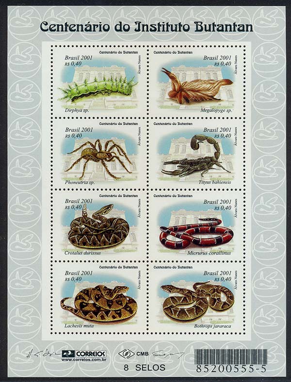 Na mini folha, o artista apresenta oito espécies de animais peçonhentos, sendo quatro espécies de serepentes mais representativas como a cascavel, do gênero Crotalus que, quando excitada, denuncia sua presença pelo ruído característico do guizo ou chocalho, a jararaca, do gênero Bothrops, que habita principalmente zonas rurais e periferias de grandes cidades, apresenta comportamento agressivo quando se sente ameaçada, e desfere botes sem produzir ruídos: a coral, do gênero Micrurus, apresenta anéis vermelhos, pretos e branco em qualquer tipo de combinaçção; e a surucucu, do gêncero Lachesis, a maior das serpentes peçonhentas das Américas, atintindo até 3,5m. Do gênero Artrópodes foram focalizadas as espécies Phoneutria, conhecida como aranha aramdeira, que, freqentemente, causa acidentes dentro das residências e nas suas proximidades e a Tityus bahiensis, conhecida como ercorpião marron, que vive em cupinzeiros, barrancos, sob pedras, troncos caídos, materiais e construções, etc. Adapatam-se bem ao ambiente doméstico. Do gênero das lagartas foram focalizadas a Dirphylia sp, que possui no dorso cerdas urticantes em forma de espinhos e a Megalopyge sp que possui "pelos" dorsais longos e sedosos de colorido variado, camuflando as verdadeiras cerdas pontiagudas e urticante. Em segundo plano, em cada selo é apresentada a imagem do prédio do Instituto Butantan. Foi utilizada a técnica de aquarela.