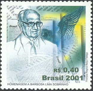 No selo, a figura de Barbosa Lima Sobrinho é apresentada, em primeiro plano, tendo, à sua volta e ao fundo, folhas impressas simbolizando a imprensa. Ao lado esquerdo, a bandeira brasileira e as asas completam o conjunto que simboliza o homenageado como ícone do nacionalismo e da liberdade de expressão. Foi utilizada a técnica de computação gráfica.
