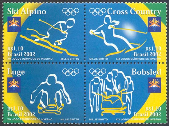 A quadra apresenta, ao fundo, a imagem estilizada da Bandeira Nacional Brasileira dentro da proposta estética do se-tenant. Em traços estilizados, cada selo apresenta uma modalidade esportiva na qual o Brasil participa. Efeitos cromáticos diferenciam o atleta de seu equipamento. A técnica utilizada foi computação gráfica.
