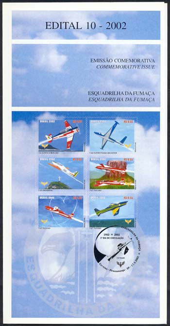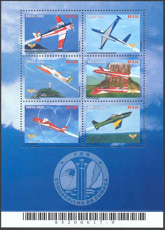 A série de selos dedicada à Esquadrilha da Fumaça traz aviões que fizeram história: o T-6 North American, o T-24 Super Fouga Magister,