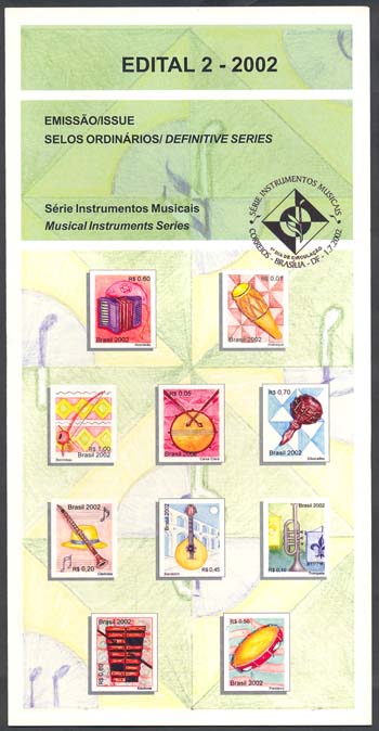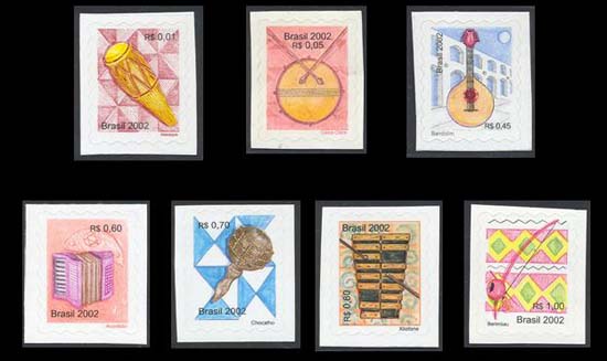 clarineta, o bandolim, o trompete, o xilofone e o pandeiro. O artista utilizou a técnica do lápis aquarelado para ilustrá-Ias. Cada selo