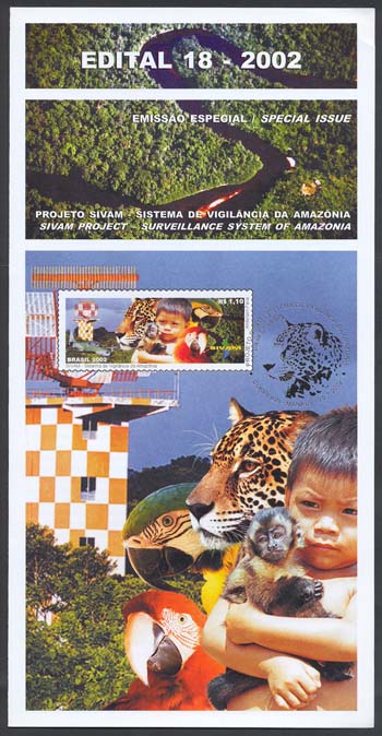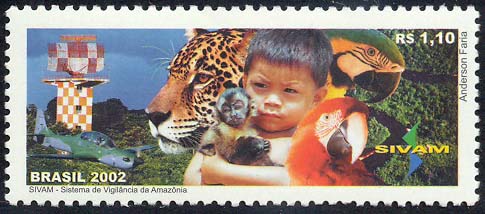 Neste selo, o projeto Sivam é representado por vários elementos. Em primeiro plano, uma criança indígena abraçada a um macaco evoca o