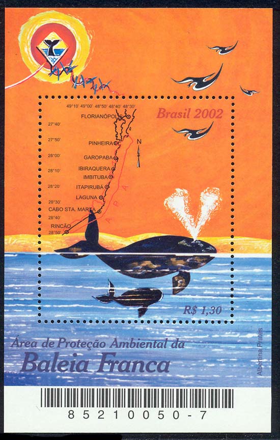 catarinense, a areia e os pássaros compõem o cenário em que a Baleia Franca se reproduz. À esquerda, um mapa apresenta importantes áreas