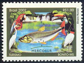 o selo retrata a paisagem natural característica da região de Bonito/MS. Sobrepostas à imagem de uma cachoeira estão algumas espécies da