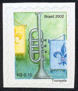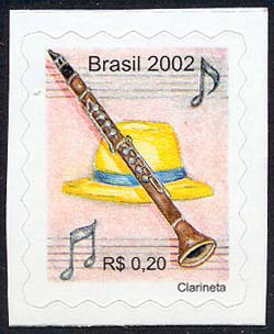 clarineta, o bandolim, o trompete, o xilofone e o pandeiro. O artista utilizou a técnica do lápis aquarelado para ilustrá-Ias. Cada selo