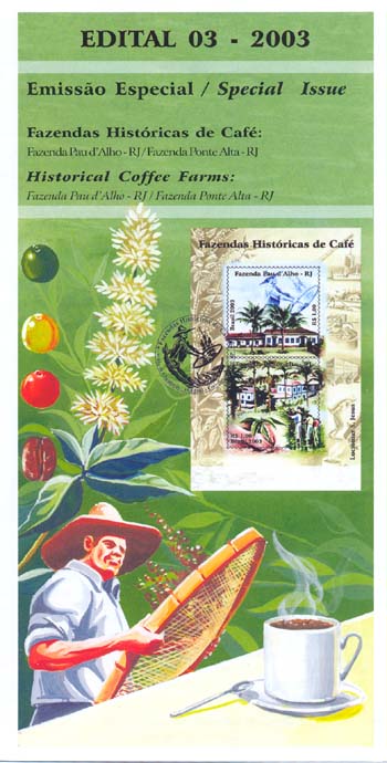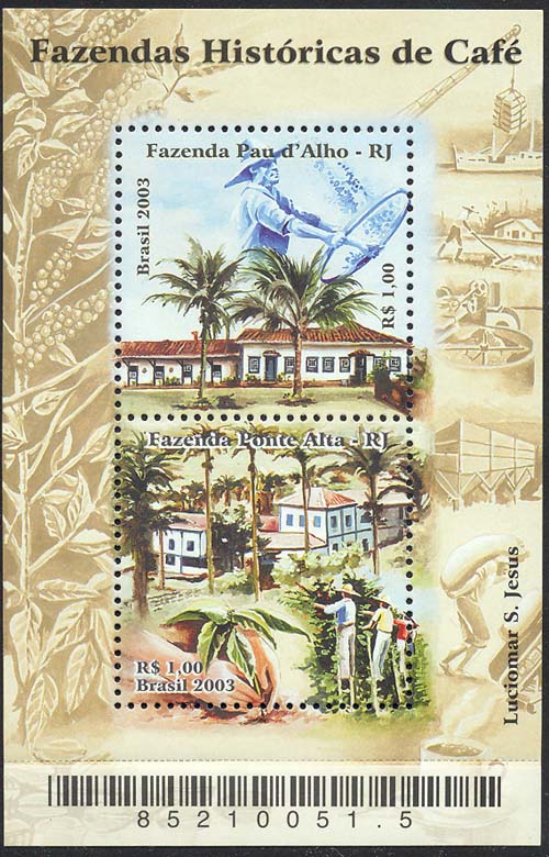 Em primeiro plano, a imagem do selo superior retrata a sede da Fazenda Pau-O'Alho, datada da primeira metade do século 19. Acima, o céu evoca um vulto do passado e retrata a opulência dos tempos áureos. O segundo selo focaliza a sede da Fazenda Ponte Alta e suas palmeiras imperiais simbolizam as riquezas dominadas pelos barões do café. Abaixo, uma muda é plantada e, ao lado, os lavradores colhem os preciosos frutos - base da economia brasileira por muitos anos. Como fundo do bloco, algumas etapas da produção do café. A técnica usada foi tinta PVA sobre papel.