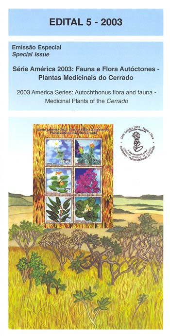 Sobre um fundo amarelo, representando vegetação do cerrado, estão dispostos seis selos que focalizam plantas medicinais do cerrado. Para reproduzir as espécies, a artista inspirou-se nas plantas in loco, buscando transmitir, com o máximo de fidelidade, os elementos de cada espécie. O céu, ao fundo, exprime campo aberto, situando as espécies em seu habitat natural. Foram utilizadas as técnicas aquarela e computação gráfica.