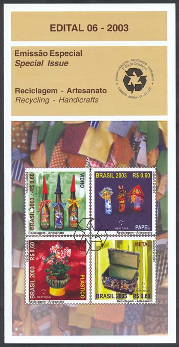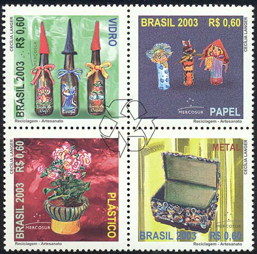 Vidro, metal, plástico e papel compõem os motivos desta quadra de selos, cujos planos de fundo são apresentados nas cores de identificação dos materiais, às quais se aplicou uma texturização, a fim de produzir o efeito visual dos materiais abordados. O verde, para o vidro, tem como exemplo garrafas de cerveja vazias pintadas a mão e reabastecidas com licor caseiro. O amarelo, para metais, apresenta um porta¬jóias decorado com sucatas. O vermelho, para o plástico, mostra um vaso de flores feito com garrafa plástica de refrigerante. O azul, para o papel, é ilustrado com títeres de papel marché. Ao centro, englobando todos os selos, o símbolo da RECICLAGEM: três setas concêntricas. As técnicas utilizadas foram lápis de cor e computação gráfica.