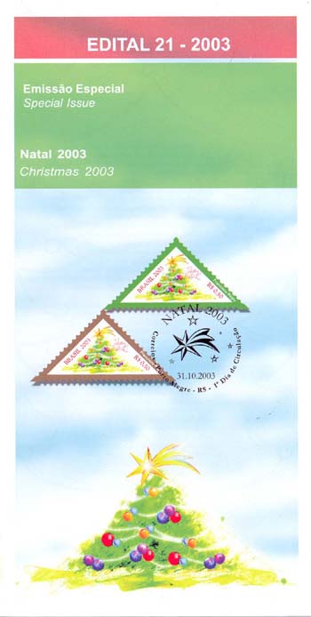 Os selos do Natal 2003 focalizam uma árvore de Natal estilizada, decorada com bolas coloridas. fitas e a Estrela de Belém na ponta, compreendendo também mensagem de felicitações. A imagem do selo é simples, dinâmica e colorida, como as próprias comemorações natalinas. Em formato triangular. um com bordas verdes escuras e outro com bordas douradas, os selos representam a própria mensagem de felicitações dos Correios nesse periodo de confraternização universal. evocando a decoração de Natal. Foi utilizada uma técnica mista de aquarela e desenho sobre papel e computação gráfica.