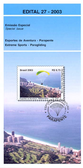 O selo traz uma fotomontagem digital de um parapente, em tons verde e amarelo, sobrevoando a região do bairro de São Conrado, Rio de Janeiro. Os praticantes do esporte consideram essa área uma das melhores e mais emocionantes para o vôo, devido ao seu relevo e ao seu clima. A paisagem retrata o mar, a praia, os prédios e um trecho da Mata Atlântica. Foram utilizadas técnicas de fotografia e computação gráfica.
