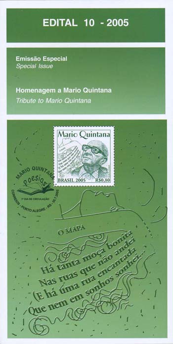 o selo apresenta, em primeiro plano, à direita, a imagem sonhadora de Mario Quintana, trabalhada com base em fotografia. À esquerda, está impresso trecho do poema "O Mapa", entremeado nos cabelos longos de uma mulher, cujo corpo repousa sobre os versos, tal qual o mapa de uma cidade, que o poeta divaga com seu olhar. A técnica utilizada foi o talho doce.
