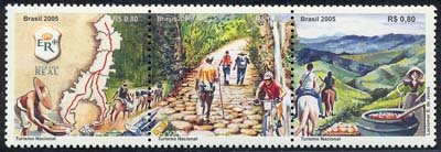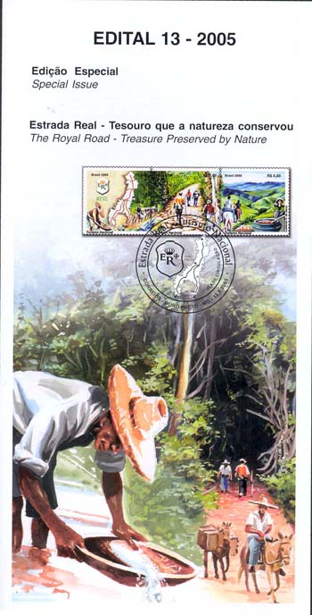 O se-tenant de três selos retrata o potencial turístico e cultural da Estrada Real. O primeiro selo destaca a logomarca da instituição responsável pelo desenvolvimento socioeconômico da região e o Mapa da Estrada, com o traçado dos caminhos velho e novo. Na parte inlerior vê-se um garimpeiro, algumas pedras preciosas e os tropeiros, simbolizando a exploração aurífera. No selo central destaca-se a estrada velha, com seu calçamento de pedras centenárias, e uma paisagem fascinante, que incentiva as caminhadas e o ecociclismo. No último selo, a cavalgada, o artesanato e a culinária completam o cenário turístico da região.