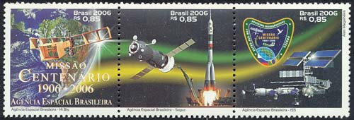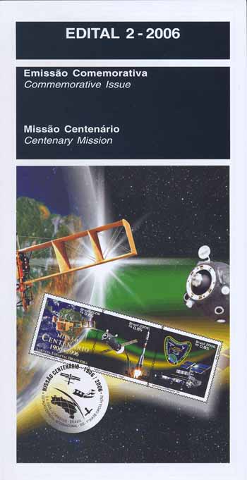 O primeiro selo referencia a Missão Centenário - 1906'2006 e a Agência Espacial Brasileira - AEB, destacando por meio da representação do 14 Bis, o vôo de Alberto Santos Dumont, em 1906, quando, historicamente, a aviação teve o seu primeiro grande momento. O segundo selo está representado pela nave espacial Soyuz e o foguete lançador de mesmo nome, simulando o momento em que se iniciará a missão espacial. O terceiro selo localiza a Estação Espacial Internacional -ISS e a logomarca da Missão Centenário, ressaltando as instituições envolvidas no Programa - DEPED(Departamento de Pesquisas e Desenvolvimento do Comando da Aeronáutica/Ministério da Defesa) - AEB(Agência Espacial Brasileira) - MCT(Ministério da Ciência e Tecnologia) e o nome Pontes, numa relerência ao Tenente-Coronel-Aviador Marcos Cesar Pontes, astronauta brasileiro. Os três selos são ligados por uma faixa verde-amarela, representando a presença do Brasil nas pesquisas cientificas espaciais inerentes à Missão.