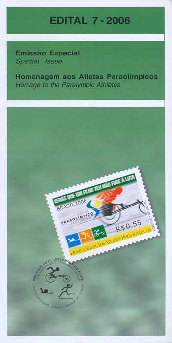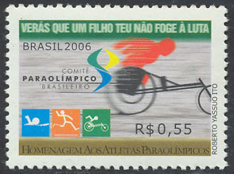O selo apresenta na parte superior um verso do Hino Nacional Brasileiro, representando a superação dos atletas paraolímpicos em suas competições e atividades desportivas. A imagem principal destaca um atleta em sua cadeira, no formato de um triciclo, própria para competições em alta velocidade. O aquecimento durante a competição é demonstrado pela cor vermelha no atleta, empenhado na execução da prova. Ao lado, a logomarca do Comitê Paraolímpico Brasileiro. No canto inferior esquerdo estão aplícados três pictogramas representando,respectivamente, as competições de natação, atletismo e corridas de atletismo para cadeirantes, nas cores azul, laranja e verde, que significam água, sol e vegetação. As faixas que molduram o selo, nas cores verde e amarelo, dão o toque de brasilidade à emissão.