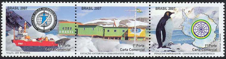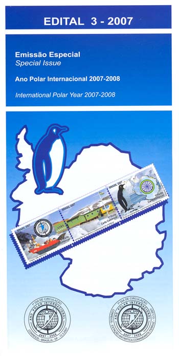 No se-tenant de três selos a artista utilizou como imagem de fundo a paisagem natural da Antártica. Enriquecendo a paisagem, o primeiro selo destaca o Navio brasileiro de Apoio Oceanográfico Ary Rongel - NapOc Ary Rongel, que presta apoio logistico à Estação Antártica Brasileira Comandante Ferraz - EACF, um dos módulos da Estação com a identificação BRASIL e a logomarca do Ano Polar Internacional; no selo do centro, são destacados outros módulos da EACF e a Bandeira brasileira e, no terceiro sel.o, o Pingüim Imperador, espécie típica da fauna da região e o mapa do Continente Antártico, tendo, ao centro, a logomarca do Programa Antártico Brasileiro - PROANTAR. Foi utilizada a técnica de computação gráfica.