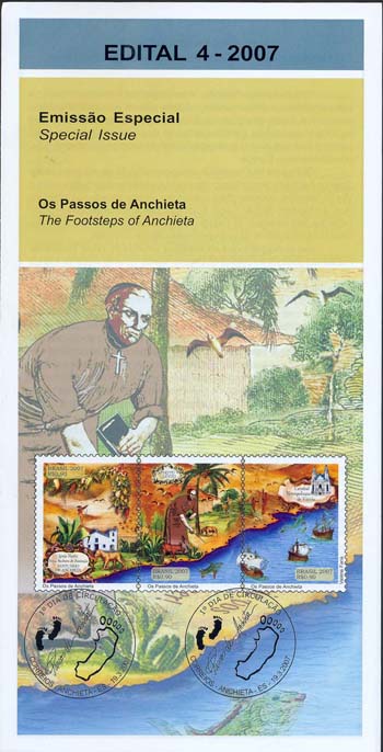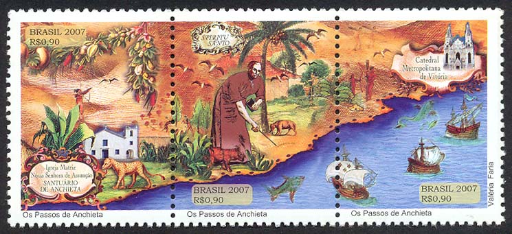 O se-tenant é composto de três selos destacando aspectos importantes da obra do Padre José de Anchieta. No selo à direita, a Catedral Metropolitana de Vitória, local onde se inicia o caminho de, aproximadamente, 100 quilõmetros de extensão, hoje conhecido como "Os Passos de Anchieta". O selo à esquerda sinaliza o término da caminhada, que se finda na Igreja Matriz Nossa Senhora de Assunção, o Santuário de Anchieta. No selo central, em destaque, a figura do Padre José de Anchieta, escrevendo na areia da praia - Hoje Vos Hei de Vencer", verso da poesia Quando, no Espírito Santo, se recebe uma relíquia das onze mil vírgens. Compondo o se-tenant, elementos típicos da época: espécies da fauna e da flora, habitantes indlgenas, bem como a orla maritima com embarcações, simbolizando os alicerces do trabalho de Anchieta. Foram utilizadas técnicas de desenho e ilustração somadas a recursos de manipulação digital, tendo como referência imagens de mapas e documentos originais do século XVI.