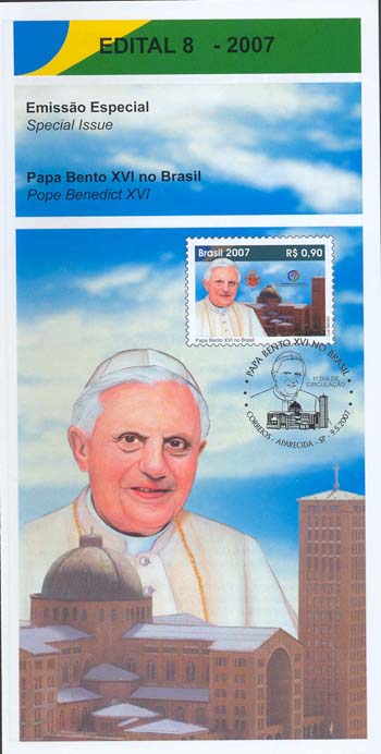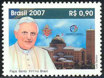 Em primeiro plano, a imagem do Papa Bento XVI. Em segundo plano, a Basilica de Aparecida, local de realização da V Conferência General Dei Episcopado Latinoamericano Y Dei Caribe. Na composição da imagem visualiza-se o Brasão do Papa e a logomarca da Conferência. Na parte superior do selo foi criado um grafismo representando a bandeira nacional. Técnicas utilizadas, ilustração à guache sobre o papel - na imagem do Papa - e computação gráfica no restante da composição.