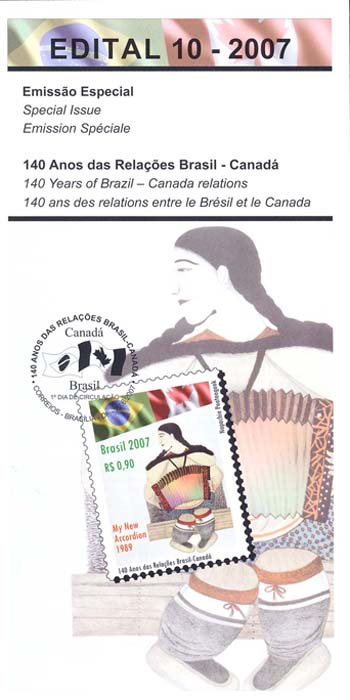 "Meu Novo Acordeão'; de Napachie Pootoogook (Cape Dorset), 1989, litografia, Museu da Civilização do Canadá CD1989-023. Muitas mulheres inuits' tocavam acordeão, instrumento trazido para o norte pelos caçadores de baleias escoceses no final do século dezenove. Com dedos ágeis, um acordeão poderia inspirar os caçadores de baleia e os Inuits a dançar ao som de canções entusiasmadas até a madrugada. Napachie Pootoogook lembra esse evento feliz de sua infância. Ela descreve seu novo instrumento como um caleidoscópio de cores, traduzindo o som de sua música em uma forma visual vibrante. Esta gravura integra a exposição de arte inuit Isumavut, que percorrerá diversas cidades brasileiras entre 2007 e 2008. Compondo a imagem do selo, na parte superior, destacam-se as bandeiras do Brasil e do Canadá. Foram utilizadas as técnicas de litografia e composição gráfica.