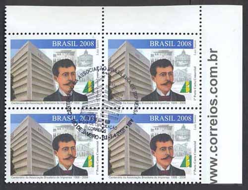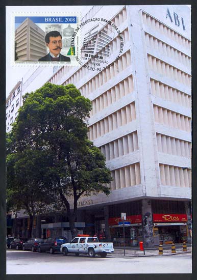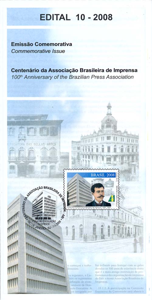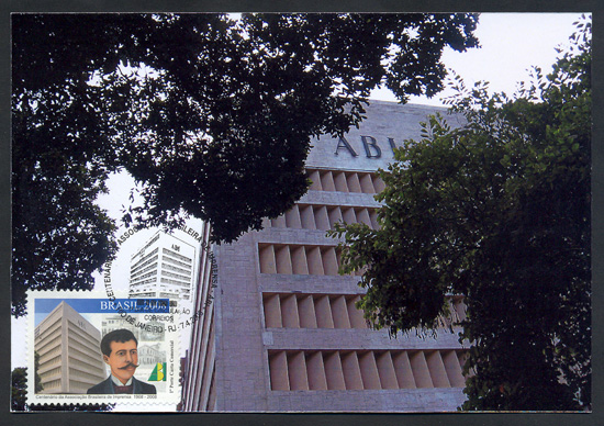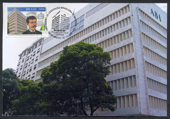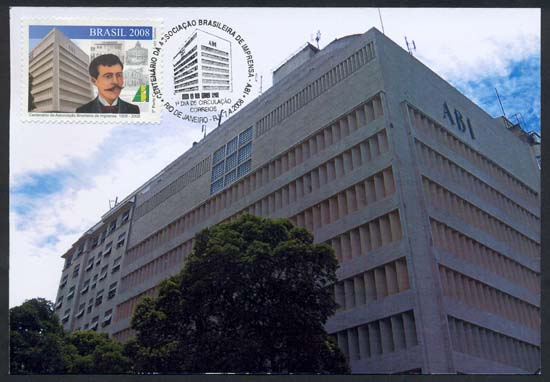 O selo traz, em destaque, a imagem da atual sede da Associação Brasileira de Imprensa - ABI, localizada no Rio de Janeiro, seguida da ilustração da face de seu fundador - Gustavo de Lacerda- e da logomarca da ABI. Ao fundo, a imagem esmaecida de uma página do jornal publicado pela ABI, com fotos de fachadas de prédios que a instituição ocupou até chegar à sua sede própria. As cores da bandeira do Brasil na logomarca da Associação e a tarja azul com a respectiva legenda imprimem brasilidade ao conjunto. Foram utilizadas as técnicas de ilustração à guache sobre papel, fotografia e computação gráfica.(Texto do edital)