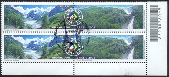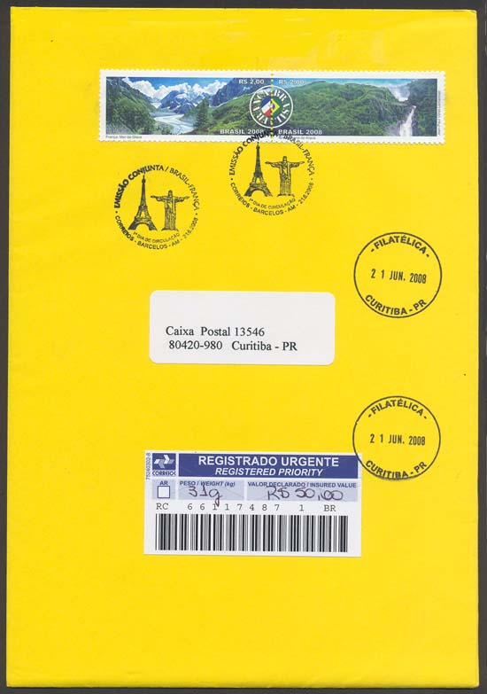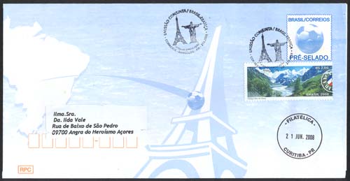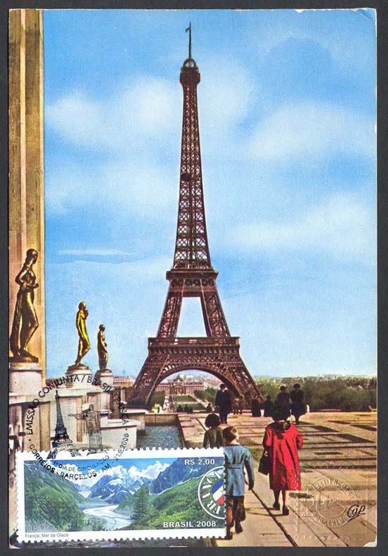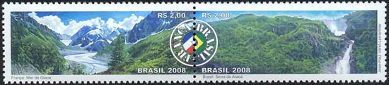 Os selos registram duas riquezas ambientais em países de continentes diferentes, ressaltando a necessidade mundial de preservação dos ecossistemas, fundamentais para o equilíbrio ecológico. O selo da esquerda focaliza o Mer de Glace, glaciar com 7km de extensão e 200m de profundidade média, nas encostas do Monte Branco, localizado em Chamonix, França, na reserva ecológica do charmoso maciço alpino, que exibe geleiras, coníferas e montanhas escarpadas. À direita, associada ao Brasil, destaca-se a floresta amazônica, representada na verdejante Serra do Aracá, e sua bela cachoeira, considerada uma das maiores do País, com 365m. Separando os selos do se-tenant, ao centro, uma estrela branca circundada pelas bandeiras nacionais da França e do Brasil, estilizadas, simbolizando o elo entre o Brasil e a França, no contexto da emissão conjunta. Foi utilizada a técnica de computação gráfica. No carimbo de 1º Dia de Circulação, são apresentados dois inconfundíveis ícones universais: a Torre Eiffel, representando a França, e o Cristo Redentor, o Brasil.