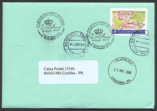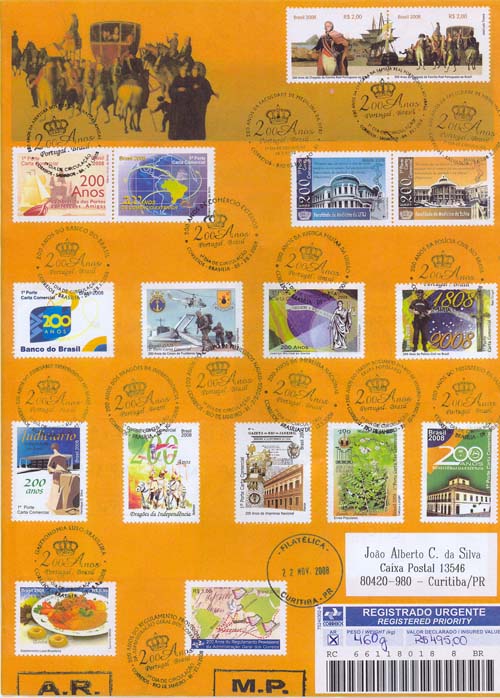 Colocamos, també, correspondência enviada no dia do lançamento deste selo, contendo todos os selos emitidos neste ano em comemoração dos 200 anos da chegada da Família Real Portuguesa ao Brasil. É uma peça diferente, pois dela constam todos os carimbos comemorativos, cada um deles aposto no respectivo selo. Para que a tarifa fosse correta, a correspondência foi enviada registrada, com aviso de recebimento e para entrega em "mão-própria", ou seja, pessoalmente ao destinatário. Dificilmente esta peça constará de uma coleção montada para fins de exposição oficial, pois provavelmente será considerada pelos senhores jurados " uma peça fabricada", apesar de ter sido circulada efetivamente. Mas constará de minha coleção "Vinda da Família Real para o Brasil" montada para exposição num evento do Shopping Cristal, em Curitiba, cujo fecho está sendo revisado. Após sua estreia, esta coleção também foi exposta no Colégio Militar de Curitiba e atualmente está montada, com redução de algumas páginas, na Agência Filatélica de Curitiba, na Rua Marechal Deodoro, 298.